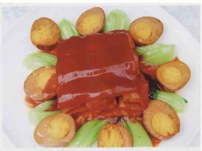 王公喜师傅告诉我这款菜,在原有基础上又加入了一些改进,首先肉必须是精选小猪肚腹上的五花肉,因为这样肉炖出来后才能酥烂,肥而不腻。其次肉和鸡蛋虽然不用烧制三天之久,但也要用小火炖制五个小时以上。只有这样,才能将汤汁中的各种香料和调料融合到肉中,将肉中的油份彻底去除,鸡蛋又可以充分地将肉汁吸透,一咬下去,蛋中满是香浓微辣的汤汁,让人又仿佛沉浸在了那个感人的故事中去了。