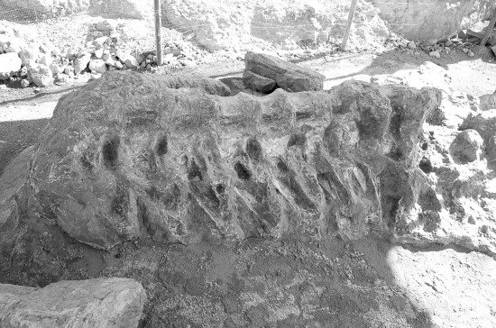 10月1日,笔者来到×奇台恐龙沟,只见在2006年中科院古脊椎动物与古人类研究所挖掘恐龙化石的二号坑内,一个遮阳篷下摆放着一具刚刚出土的巨型古脊椎动物化石。