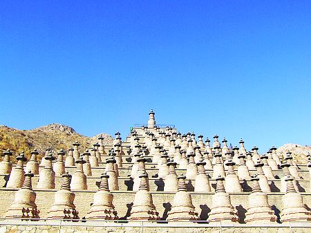在青铜峡峡口山西山坡前,有一组排列有序,极为规则的塔群,自上而下以一、三三、五五、七、九、十一、十三等奇数排列,共有12行108座。这些塔群坐西朝东,背山面水,随着山势凿山分阶而建,塔群依靠着山势,像大金字塔一样,在天空下,透出一种神秘的味道。