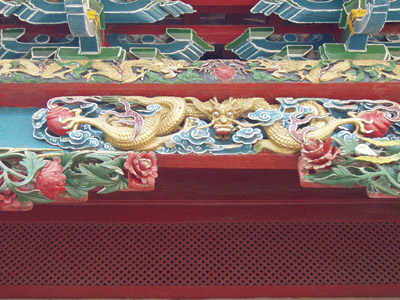 为凸现大成殿的巍峨,在其殿下专门建筑有距地面1米高的月台(相当于现在的地基)。大成殿宽22.65米,屋顶全部覆盖绿色琉璃瓦,象征头顶蓝天;正中央的屋脊是琉璃烧制的二龙戏珠、人物、宝瓶、彩珠等;在四角的下垂屋脊以及其他部位还设置有琉璃狮子、小狗等,大殿屋檐下四周也设有拱形饰品。最值得一提的是大成殿门头上方的立体雕刻牡丹、龙等饰品,在国内也是少见的。