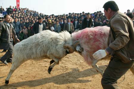 斗羊,民间俗称羝羊。角斗者小尾寒羊因其生长速度快、耐粗饲、抗病力强、繁殖率高、皮肉兼用等特点,被誉为“中华国宝”,特别是公羊个头大、好斗,被专家称为世界超级巨羊,是进行肉羊生产的最佳基因库。之所以能保存至今,而且品种没有退化,据称这与民间盛行的斗羊有很大关系。在养羊户中,养公羊的专养公羊,是配种专业户,靠配种赚钱。养母羊的专养母羊,靠卖羊羔赚钱。这样就避免了近亲结婚,保持了羊群的品质。民间就是用羝羊的方式优胜劣汰选择公羊的。