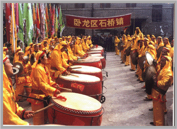 南阳石桥镇威风锣鼓起源于明朝中期,在明末清初最为兴盛,形成了内八道社、外八道社。改革开放后,石桥镇政府高度重视传统文化的挖掘和整理,由文化站协助一村、二村、小石桥、施庄、和寨等五个村,利用尚在的老艺人又重新组建。锣鼓队共有15盘大鼓,60副铙,70副钗,80面龙凤大彩旗,400多套明代服装,共400多人参加的锣鼓队。使用的鼓的最大直径1.5米,最小的1米,高50公分;铙最大的18斤,最小的13斤;钗一般在3—4斤左右。