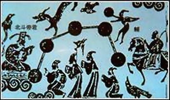 这是中国早期的星象图,它是一幅砖刻而成的壁画。反映了中国古代的星象观念。中国人把天上的星空按三垣,四象,二十八宿划区分为不同区域。