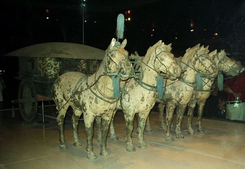 1980年,考古队在陵墓以西20米处发掘出来两套华丽的青铜车马。它们显然不是战车,而可能是秦始皇巡游全国寻找长生不死药时所用战车的复制品。两辆马车中,较小的那辆覆盖着一个伞状的青铜华盖,华盖有22根辐条。车上站立着一个御官俑,他携带一把剑、两个青铜盾、一支弩弓,以及66支箭的箭盒。他的头饰上的番号表明他隶属于“第9营”。