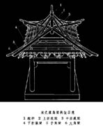 ① 柱。直立承受上部重量的构件。按外形分为直柱、梭柱,截面多为圆形。按所在位置有不同名称:在房屋最外圈的柱子为外檐柱,外檐柱以内的称屋内柱(金柱),转角处的称角柱等。柱有侧脚,即向中心倾斜;有生起,即自中间柱向角柱逐渐加高。