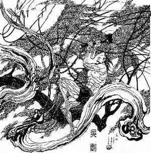 又《山海经》中,吴刚又叫吴权,是西河人。炎帝之孙伯陵,趁吴刚离家三年学仙道,和吴刚的妻子私通,还生了三个儿子,还生了三个儿子,吴刚一怒之下杀了伯陵,因此惹怒太阳神炎帝,把吴刚发配到月亮,命令他砍伐不死之树 - 月桂。月桂高达五百丈,随砍即合,炎帝就是利用这种永无休止的劳动为对吴刚的惩罚。