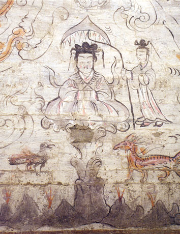 甲子这天是个吉日,周穆王手捧白色的圭、黑色的璧、色彩鲜艳的锦缎敬献给西王母,受到西王母的热情款待。第二天是乙丑,也是黄道吉日。周穆王借西王母的瑶池圣地设下酒宴,回请这位西方至高无上的女神。西王母的心情非常好,在席前即兴吟唱道:“白云在天,山岭自出。道里悠远,山川间之。将子无死,尚能复来。”
