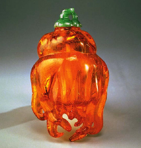 雕成佛手形式,全器透明呈金黄色,有天然的冰裂纹,以翠蒂为盖,配色别出心裁,灵巧精致。 金珀佛手鼻烟壶。 时代:清 高:7.1公分。