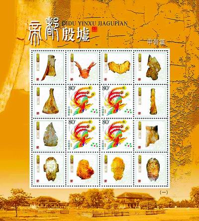 据安阳市邮政局局长曹建申介绍,在中国社会科学院安阳考古工作站、安阳殷墟博物苑、安阳市文联等单位的支持下,选出100幅最精粹、最能代表殷墟的出土文物照片,研发设计出了100枚个性化邮票——《帝都殷墟》。《帝都殷墟》集邮品系列共分青铜篇、甲骨篇、玉器篇、殷墟遗址篇4个主题。其中,青铜篇涵盖了礼器及生活用品,如著名的司母戊大方鼎、牛鼎、鹿鼎、四羊方尊等精美器皿;甲骨篇则展示了牛头刻辞、鹿头刻辞、卜甲、卜骨及甲骨文十二生肖等;玉器篇有玉类礼器、人物及动物肖像、刀具及饰品等;而殷墟遗址篇则包括两部分,一是宫殿、宗庙及王陵遗址的12个景点;二是殷墟拾贝类,如白陶、古雕、象牙、贝币等。每个主题2版,每版12枚,共计8版96枚。外加小本票4枚,共100枚。