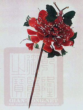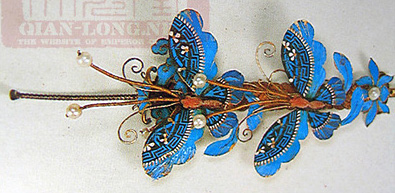 宝石做成的花辨、花蕊的底部钻上孔,穿细铜丝,绕成弹性很大的弹簧,轻轻一动,擅摆不停。使飞禽的眼睛、触角,植物的须叶、枝杈形象逼真,维妙维肖。戴在女性头上无疑增加了几分娇态美姿。