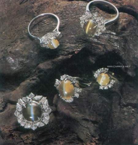 猫眼石是因为它本身如猫眼一般溜溜转动的色彩而被命名,因此以英文直译也称为‘猫眼石’也只有金绿宝石猫眼可直称为猫眼。猫眼石具有蜂蜜的色彩,尤其是它的一道光痕,会映到两侧面成为‘3道光痕’,因此它的价格被评断得很高。以颜色而论,奶油色及柠檬色次于蜂蜜色,而褐色和灰色的评价则较低。把猫眼放在光线之下。可以显现出一条很清楚的光线,而转动它时,光条则会产生左右摇动的现象,这就是猫眼的变色现象。