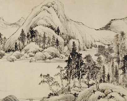 图中峰峦绵延,于高低错落中显现出逶迤起伏的节奏感。在移步换景的设陈布势及草木树石的勾描笔法上均可见董氏对黄公望绘画艺术的传神表达。近景形态各异的树木相互遮掩地生长在凹凸不平的坡地上。树干以墨线双勾,用淡墨或皴或晕,增强了其明暗效果及立体感。树叶的表现更为丰富,有的以侧锋卧笔大点横贯,有的用浓淡墨相互交叠,有的直接落笔画线成叶,有的则以细线双勾成夹叶状。画家笔下的树木山石不重形貌而重其内在的神韵本质,同时笔墨的自身韵味也成为画家自觉的追求,这些都表现出明代晚期山水画的美学特征。
