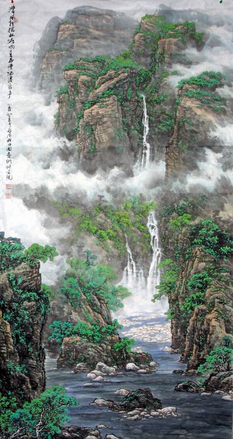 作者李冠德,著名山水画家,河北省美术家协会会员,中国画研究会理事,九馨中国书画研究会会长,東方画院院长。 三十多年来,画家对山水画进行了系统地研究和探索,积累了丰富的创作经验,形成了自已独特的艺术风格和创作技巧,作品氣势恢宏,笔墨酣暢、色彩绚丽、秀美清新,既有横刀立馬之大笔挥灑,又有精细致微之刻划描写,既有传统笔墨的意蕴,又有鲜明的現代思维和氣息,巧夺天工,别具一格,曾多次参加国内外美术展览,1993年、2002年分别在石家庄、烟台举办个展,第三届中国艺术品博览会上,获《中国最具收藏价值作品500强艺术家》称号,2001年,作品《春山泉韵》由人民大会堂收藏,2005年,三幅作品入选《中国艺术名家三十强联展》画集,并出版有《2001年山水画集》《儿童绘画入门》等著作。 该画家作品极具收藏和观赏价值,有很大的升值潛力。