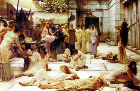 塔得玛醉心于女性题材的绘画,他常以女性题材去表达一种美的理念。这幅画中,他以离奇的场景,描绘了数十个性格、气质、神态各不相同的女性美感。看得出,他醉心于古希腊罗马的妇女生活题材,严格地遵循学院派的古典画法,刻意追求画面的视觉美感,并以自己的眼光去体现古希腊罗马时的妇女生活。
