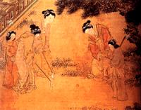 宣宗的私人球场上,草皮剪裁的平服妥贴,四大片草皮上共有十个球洞,正如今天高球场在每个球洞插有旗杆,图中每个球洞也各插有不同颜色的彩棋作为提示。