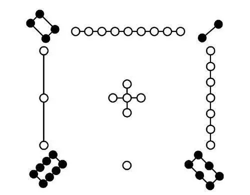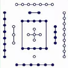 西方:四个黑点在内,九个白点在外,表示白虎星象,五行为金。
