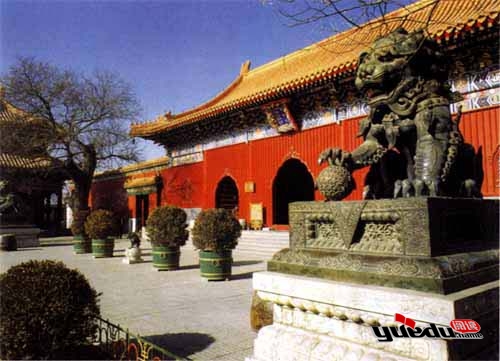 雍和宫位于故宫的东北,北新桥北街路东,是北京最大、保存最完好的喇嘛寺。建于清康熙三十三年(1694年),原为康熙四子即后来雍正皇帝的府邸.雍正三年(1725年)始称为“雍和宫”。雍正驾崩后,灵柩停在雍和宫内永佑殿。为此,将殿宇升级,在15天内把原来的绿色琉璃瓦全部换成黄色,所以雍和宫又称雍正祠堂。乾隆九年(1744年),雍和宫正式改为喇嘛庙。雍和宫占地约6.64万平方米,主要建筑有天王殿、雍和宫、永佑殿、法鸵殿、万福阁等。殿宇融合了藏汉二种式样的建筑风格,既有宫殿金碧辉煌的华丽,又有古刹庄严肃穆的气氛。