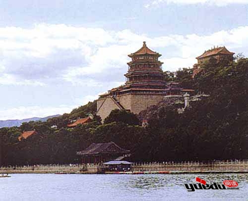 佛香闻是颐和园的标志建筑。为八面三层四重檐木结构,高达41米.圆顶金碧,气势恢弘。佛香阁一层内供奉着一尊5来高的“南无大悲观世音菩萨”铜胎鎏金站像,菩萨干手千眼,形态丰满。二层正中张挂着一幅万舟山寿明湖石碑拓片,乾隆皇帝御题的碑文记叙了昆明湖的开挖经过。佛香阁后游廊上方,是一座五色的琉璃牌坊“众香界”。众香界后面的智慧海,是万寿山的顶端建筑,因整座建筑用砖石砌成,亦称“无梁殿”,其表面嵌有千尊无量寿佛。智慧海是万寿山的至高点,亦为后山中轴线的终点。