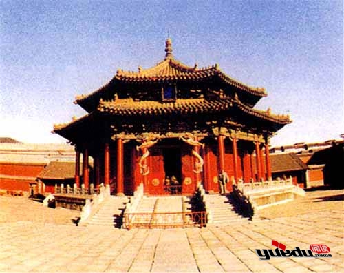 大政殿是一座八角重檐亭式建筑,正门有两根盘龙柱,以示庄严。大政殿用于举行大典,如皇帝即位,颁布诏书,宣布军队出征,迎接将士凯旋等。十王亭则是左右翼王和八旗大臣办事的地方。这种君臣合署在宫殿办事的现象,历史上少见。从建筑上看,大政殿也是一个亭子,不过它的体量较大,装饰比较华丽,因此称为宫殿。大政殿和成八字形排开的10座亭子,其建筑格局乃脱胎于少数民族的帐殿。这11座亭子,就是11座帐篷的化身。帐篷是可以流动迁移的,而亭子就固定起来了,显示了满族文化发展的一个里程。大殿耸出的八角,为满族八旗制度的象征,而殿顶的黄瓦铺顶、绿瓦镶边,则表达着北方少数民族对森林、草原绿色的钟爱。