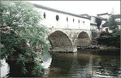 古徽州其他地方的古石桥均各有特色。休宁齐云山下的登封桥,建于明万历十五年,8墩9孔,青石砌筑,原桥中有亭庙,两端各有石坊。桥头古树浓阴,水埠槌声阵阵,江上竹筏漂流,清清的碧水倒映着古桥的身影。来到万安镇轮车村,眼前的轮车桥小巧玲珑,长仅15米,爬山虎布满桥体。