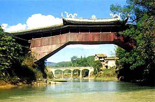 三条桥位于浙江省泰顺三魁镇薛宅村,地处温州垟溪乡和洲岭乡交界地,由原先三巨木跨河为桥而得名,始建于宋绍兴七年(1137),重建于道光二十三年(1843),现为木叠梁拱式廊桥。全长26.63米,宽4米,离水面高10米。呈八字形伸臂,其上建桥屋11间,明间五架抬梁,柱头有碟形莲花瓣头拱座。是泰顺历史最悠久的木拱廊桥,也可能是世界最早建筑的“廊桥”。当年在拆旧桥时发现有贞观年号的旧瓦,因此有人猜测三条桥最早可能建于唐代。