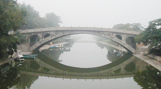赵州桥又叫安济桥,坐落在河北省赵县城南五里的洨河上。赵县古时曾称作赵州,故名。赵州桥是隋朝石匠李春设计建造的,距今已有近1400年,是世界现存最古老最雄伟的石拱桥。赵州桥只用单孔石拱跨越洨河,石拱的跨度为37.7米,连南北桥堍(桥两头靠近平地处),总共长50.82米。采取这样巨型跨度,在当时是一个空前的创举。更为高超绝伦的是,在大石拱的两肩上各砌两个小石拱,从而改变了过去大拱圈上用沙石料填充的传统建筑型式,创造出世界上第一个“敞肩拱”的新式桥型。这是一个了不起的科学发明。象赵州桥这样古老的大型敞肩石拱桥。在世界上相当长的时间里是独一无二的。在欧洲,公元14世纪时,法国泰克河上才出现类似的敝肩形的赛雷桥,比赵州桥晚了700多年,而且早在1809年这座桥就毁坏了。隋代著名石匠李春的杰出贡献在世界桥梁建筑史上永放光辉。