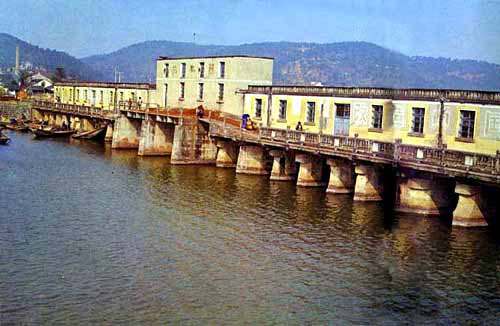 三江闸桥位于浙江省绍兴北35里处的三江口(钱塘、曹娥、钱清三江汇合地)。这是一座桥闸结合的建筑,其下是28孔的水闸,闸顶端相连一起,可行人走马拉车,成一平坦大桥。闸桥全长108米,宽9.16米,其桥墩亦即闸墩全是两头尖的梭子墩,每一墩由每块约千余斤大石砌成,自下而上筑成,底层与岩基相卯,再灌注生铁,每层块石之间,用榫卯街接,并以秫灰胶住。每隔五墩设置一个大梭墩,关键地段,仅隔三墩。梭墩深浅视岩基高低而定,最深达5.4米,最浅亦有3.4米,每一闸洞下的基石上,置内外两槛,以承闸门。为明代嘉靖年间绍兴太守汤绍恩所建。闸桥建成后,历经六次修理。现在大闸东南一段的八小墩、三大墩、十二孔和西北一段的八小墩、二大墩、十一孔,计二十一墩、二十三孔仍为明代原物。省级文物保护单位。