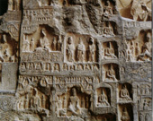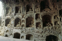 古阳洞位于龙门西山南段中部,是龙门石窟开凿最早、内容最丰富而规模宏大的一座石窟。它开凿于公元493年或此之前,考为北魏孝文帝为其祖母冯太后营造的功德窟。支持孝文帝改革和迁都的一批王公贵族、高级官吏和僧侣也多于该洞发愿造像。古 阳洞内窟顶及其余部位都布满了大小不等的各式各样的佛龛,南北两壁有计划的安排成三列大型佛龛,且佛龛大多数都刻有“造像铭”,统计多达800多品,因而古阳洞又是中国石窟保存造像铭最多的一座洞窟。魏碑书体精华“龙门二十品”该洞就占19品。