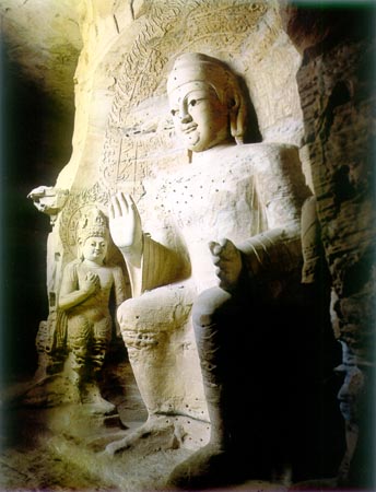 主像是三世佛,正中的身披千佛袈裟的释迦佛,高15.5米。东壁上部的弟子群,雕刻技法十分熟练,堪称杰作。