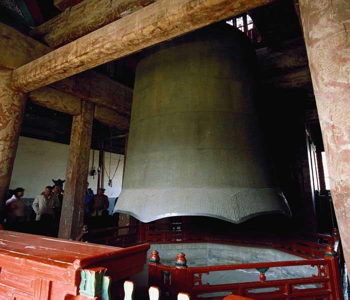 大钟铸于明永乐年间,距今已500多年。钟通高6.94米,外径3.30米,钟唇厚度18.5厘米,重量46.5吨。钟身内外整齐地铸有佛教经典17种,总计227000多字,字体工整、坚韧、相传为明朝书法家沈度的手笔。大钟具有五绝: