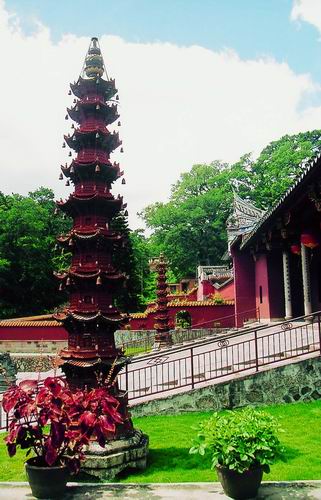 鼓山涌泉寺为“闽刹之冠”,又是全国重点寺庙之一。寺建在海拔455米的山腰,前为香炉峰,后倚白云峰,有“进山不见寺,进寺不见山”的奇特建筑格局。相传它的旧址为“华严寺”。唐建中四年(783年),有龙居灵源洞,从事裴胄认为“神物所蟠,宜寺以镇之”,请高僧灵峤人山诛茅设台念《华严经》,从此龙不为害。五代后梁开平二年(908年),闽王王审知延请国师神晏主持修建新寺,寺成之后赐名“国师馆”。因天王殿前有罗汉泉,后梁乾化五年(915年),改名为鼓山白云峰涌泉禅院。明永乐五年(1407年)称涌泉寺。永乐六年(14O8年)和嘉靖二十一年(1542年),寺两次毁于火。万历、天启间相继修复。清顺治初僧元贤又主持重修。清康熙三十八年(1699年),康熙皇帝颁赐的御书“涌泉寺”泥金匾额至今仍高悬于天王殿寺门之上。