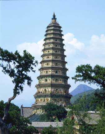踏出山门,一座耸入云天的琉璃宝塔——飞虹塔,赫然入目。据佛经《大唐西域记》记载,此塔为全国十九佛塔之一。这座造型别致、设计艺术高超的琉璃塔,为明代建筑。据修碑志记载,此塔始建于唐朝,后因元时大地震毁坏,明正德十年(公元1515年)开始重建,落成于明嘉靖六年(公元1527)年。这座八面玲珑、工程浩大的琉璃塔从动工到竣工历时十二个春秋。九十余年后,天启二年又用了两年的时间增建了围廊(公元1622-1623)。全塔呈八角形,分十三级,高达47.13米,塔内转折攀登的梯道,设计巧妙,直通塔顶,为国内所罕见。塔身由青砖砌成,层层皆有琉璃出檐,下三层尤其精致,有飞檐凌空下的斗拱,捏制精巧的莲花椅柱,还有佛像、菩萨、金刚盘龙卧虎、奇兽珍禽等色彩艳丽的图案。飞虹塔坚如磐石,虽已经经受了四百余年的风雪侵蚀,但仍完好无损。清康熙三十四年(公元1695年)平阳盆地发生八级大地震,它也安然无恙。塔顶有当年地震的题记,为研究当年平阳地震情况提供了宝贵资料。据建塔碑记载,塔为一文秘家园所设计,今襄汾柴村人,法名达连。达连和尚为此塔精心设计了四十余年,后用十二年主持建塔,在过去科学技术不发达的情况下,能建造出这样一座耸入云天的飞虹宝塔,不仅是我国建塔史上一巨大成就,而且充分表现了我国古代劳动人民高度的智慧和卓越的才能。因塔全身由土色琉璃装饰,每逢红日高照,塔身金碧辉煌、熠熠闪光,远眺仿佛是一条美丽的彩虹,故此得名“飞虹塔”。微风吹过,全塔上下一百一十二个铁玲发出叮叮当当的响声,好象在奏一曲优美动听的音乐,轻音缭绕,令人心旷神怡。正象明人王翰所题:“一塔玲珑驾碧空,满山翠柏起秋风,云生宝殿常僧定,咫尺虚弥未许通。