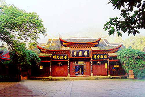 报国寺位于四川省峨眉山麓,创建于明万历年间,为全山八大名寺之一,也是山下的第一座寺庙,峨嵋山佛教活动的中心。全寺占地近4万平方米,规模宏大。共有四座大殿,从前至后分别是弥勒殿、大雄殿、七佛殿、藏经楼,均建于清代的同治年间。四殿依山而建,一重高于一重。寺内正殿原供奉着佛、道、儒三教的代表,曾名“会宗堂”,有“三教会宗”的意思。清康熙帝取佛门“报国主恩”意,改名报国寺。寺中殿宇门窗雕刻精巧,生动美观;楼台亭阁分布匀称,古朴壮丽。前殿有明代铸造的紫铜华严塔,塔高7米,共14级,上刻佛像4700余尊和华严经的经文。寺门正对的小山上有一铸于明代的莲花铜钟,高2.8米,直径2.4米,重量达到12500公斤,号称“天府钟王”。钟身铸有61600字,有《阿含经》及其他佛偈、铭、疏和晋唐以来历代帝王和高僧的名讳。