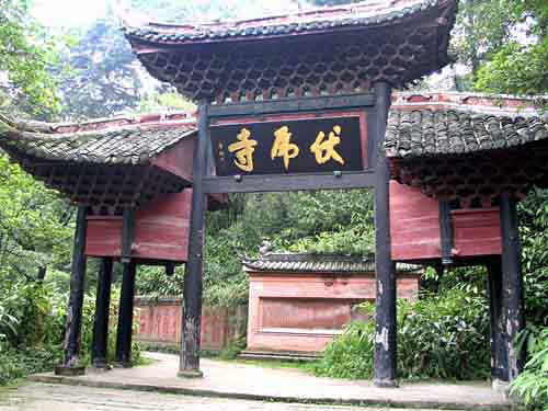 伏虎寺在四川省峨眉山麓伏虎岭下,距报国寺西约1000米处。始建于唐,宋时名神龙堂,后因附近常有虎患,寺僧建尊胜幢以镇压,更名伏虎寺。此寺为峨眉山大庙之一,几经兴废,现存为清朝重修。寺宇建筑纵横交错,构成若干四合院。殿堂宽敞,气势巍峨,四周楠木参天,浓荫蔽日。寺虽覆子翠绿中,但屋瓦终年无败叶,清康熙帝曾题赐匾额“离垢园”。正殿外立有华严宝塔亭,亭中有座高达5.8米的紫铜古塔。塔身铸造有佛像4700余尊,以及《华严经》195048字。寺外泉边有桫椤树,又名峨眉树蕨,是距今1.7亿年前与恐龙同时的植物中至今仅存的几种之一。