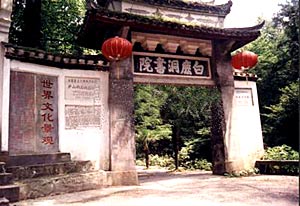 白鹿洞书院在唐代(公元618—907年)时原为李渤兄弟隐居读书处。根据文献记载,“渤养白鹿自娱,人称白鹿先生”。后来李渤任江州刺史,旧地重游,于此修楼建亭,引泉植花,遂成为一处游览胜地,取名白鹿洞。五代南唐升元年间,在此建立了“庐山国学”;宋(公元960—1127年)初扩建为书院,并正式定名为“白鹿洞书院”。白鹿洞书院是中国历史上第一所完备的书院,与岳麓、雎阳、石鼓并称“天下四大书院”。北宋末年,书院毁于兵火,南宋淳熙六年(公元1179年),朱熹出任南康太守,重建院内的建筑,延请名师,充实图书,亲临讲学,并奏请赐额及御书,于是书院的名声大振,宋时著名的哲学家陆九渊、王守仁等都曾在此讲学。后代书院又几经兴废,现存建筑多是清道光年间修建的。