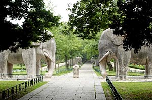 在四方城的西北,过霹雳洞上的御河桥是神道,神道的两侧自东向西依次排列着十二对石兽:狮、獬豸、驼、象、麒麟、马,每种四只,两蹲两立,共十二对,逶迤绵延达一里多地。之后,神道又折向北,有华表(望柱)一对在前,继而是巨大的石像四对,两武两文,威武雄壮,神态肃穆。石刻线条粗率,简约生动,是明初石刻的重要作品。在神道的尽头处再向北18米是棂星门遗址,现仅存石雕柱础六个。由棂星门折向东北275米,是御河桥,桥南向,原为五孔,已改为三孔。