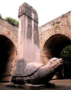 下马坊即孝陵的入口处,是一座二间柱的石牌坊,额枋上刻“诸司官员下马”六个楷书大字,谒陵的文武官员,到此必须下马步行。坊高约9米、中间宽约6米、额枋长约6米、高1.28米、厚约0.32米,曾毁坏成数块,倒置路旁,后来修复。坊旁有明崇祯十四年(公元1641年)立的禁约碑,重申严格保护孝陵的条例,违者立即处死。过孝陵正门大金门,到四方城,四周围墙形如壁垒。城内有一大石兽,昂首曳尾,宛然若生,背上驮“大明孝陵神功圣德碑”,碑文正楷,长达2746字,字大如拳,历述了明太祖一生的功德,是明成祖朱棣永乐三年(公元1405年)为其父朱元璋所立的。碑通高8.84米,碑身高4.78米,宽2.24米,厚0.83米,是南京地区地面现存石碑中最大的一个。