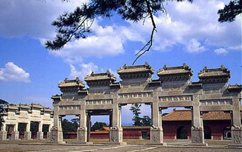 雍正皇帝的泰陵是西陵建筑年代最早、规模最大、体系最为完整的陵墓。陵园始建于雍正八年(公元1730年),乾隆二年(公元1737年)竣工,雍正帝和一后一妃葬于此陵。陵入口处的标志是三座巨大的石牌坊,过了石牌坊是一条宽10米、长2.5公里的神道,神道将中轴线两侧的建筑贯通起来。进入大红门后,北侧是具服殿,殿北是30多米高的圣德林功碑亭,重檐歇山顶,亭内的碑石上记载了雍正帝一生的功绩。碑亭的四角各立有一座汉白玉石的华表,满刻云龙纹的浮雕,气势庄严。由此过七孔石桥,神道两侧排列的石兽、石人等皆垂首肃立,神态恭谦。再往北蜘蛛山后就是龙凤门,四壁三门,上有用琉璃制作的云龙花卉装饰。门的两侧是碑亭、神厨库、井亭等建筑。再北是主殿隆恩殿,殿内明柱沥粉贴金包裹,顶部饰旋子彩画,梁枋装饰金线大点金,殿宇金碧辉煌。殿后依次是三座门、二柱门、石五供、方城、明楼等建筑,宝城的下面是地宫,雍正帝和后妃就合葬于此。