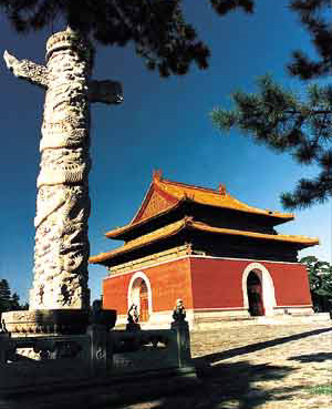 清西陵各陵的规制与泰陵的规制基本相同,唯有道光帝的慕陵形制特殊,别具一格。道光帝原建陵于东陵的宝华峪,历时七年竣工,后因地宫浸水,又改建于西陵的龙泉峪。陵园的规模较小,没有大碑搂、石像生、明楼等建筑,殿宇也不施彩绘,但隆恩殿全部是用楠木建造的,精美异常,殿内的藻井、檩枋等构件雕刻有数以千计的游龙,龙首高昂,形体矫健,就像是飞腾于波涛云海之中,极富变幻。因为楠木的香气十分浓郁,再加上龙首吞云吐雾,便具有了“万龙聚首,龙口喷香”的艺术效果。