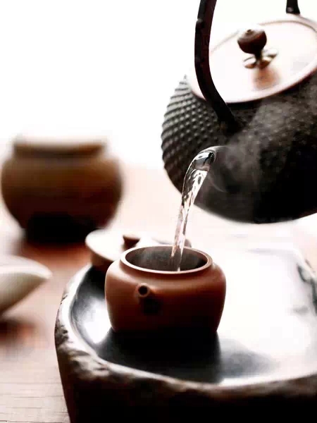 石质的茶托质朴沉稳,一切搭配得都与季节相仿,温润的紫砂壶被填入茶叶,放在同为石质的茶海上,与瓷器茶壶相比,滋养许久的紫砂壶不仅能更好地蕴藏香味使之慢慢散发,细密的气孔更能过滤普洱的些许涩味,让茶水的润滑口感格外明显,泡出醇厚的滋味。敞口的杯子一一放在我们面前,一旁日本南部铸铁壶里的水已经发出沙沙的声响,古人讲究茶道,对水也挑剔,用铁壶可以让煮出的水有很软的口感,并能提高和保存水的温度,让水变得甘甜、顺滑,口感也更为饱满,用来泡茶,是锦上添花,能激发普洱的内质陈香和茶韵,溶在水中的铁质,也有利于身体健康。一切都已准备妥当,听着渐渐沸起的水声,我们期待这一泡好茶的冲开。