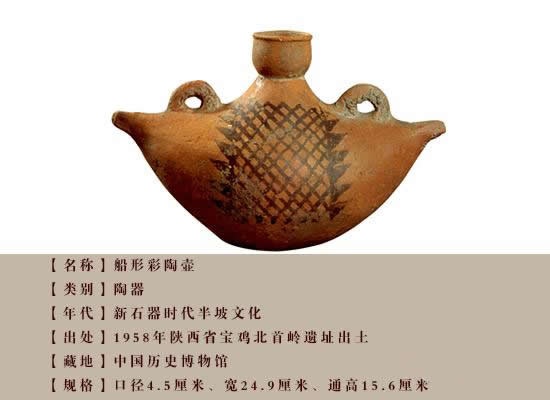 该器为1958年陕西省宝鸡北首岭遗址出土泥质红陶,口部呈杯状,器身横置,上部两端突尖,颇像一只小船。在两侧的腹部,各用黑彩绘出一张鱼网状的图案,鱼网挂在船边,似正撒网捕鱼,又像小船刚刚捕鱼回来,在晾晒鱼网。陶壶上端两肩上,横置两个桥形小耳,既便于提拿,又可穿绳背负,随身携带。