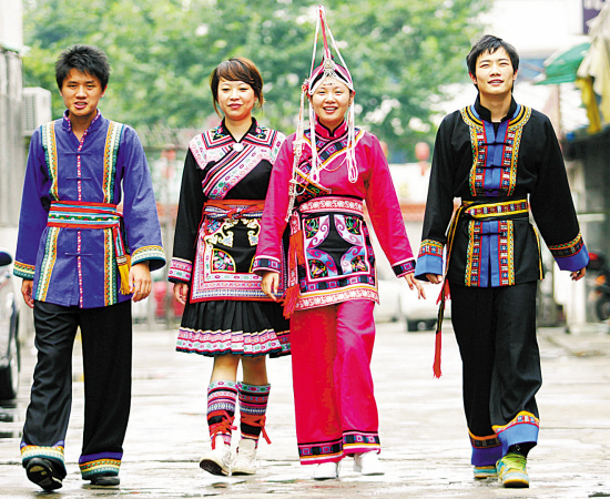 女子服饰畲族妇女的服装独具特色,大多是用自织的苎麻布制作,有黑蓝两色,黑色居多,衣服是右开襟,衣领、袖口、右襟多镶有彩色花边,一般来说,花多、边纹宽的是中青年妇女的服装。她们均系一条一尺多宽的围裙,腰间还束一条花腰带,亦叫合手巾带,宽四厘米,长一米余,上面有各种装饰花纹,也有绣上“百年合好”、“五世其昌”等吉祥语句的。还有的是用蓝印花布制作的,束上它别有一番风采。衣服和围裙上亦绣有各种花卉、鸟兽及几何图案,五彩缤纷,十分好看。别外,有些地区的畲族妇方系黑色短裙,穿尖头有穗的绣花鞋;有的喜爱系入幅罗裙;裙长及脚面,周围绣有花边,中间绣有白云图案;还有的不分季节,一年到头穿短裤,裤脚镶有锯齿形花边,裹黑色绑腿,赤脚。
