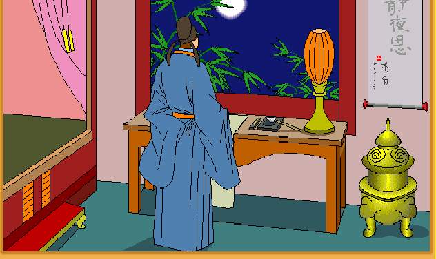 月白霜清,是清秋夜景;以霜色形容月光,也是古典诗歌中所经常看到的。例如梁简文帝萧纲《玄圃纳凉》诗中就有“夜月似秋霜”之句;而稍早于李白的唐代诗人张若虚在《春江花月夜》里,用“空里流霜不觉飞”来写空明澄澈的月光,给人以立体感,尤见构思之妙。可是这些都是作为一种修辞的手段而在诗中出现的。这诗的“疑是地上霜”,是叙述,而非摹形拟象的状物之辞,是诗人在特定环境中一刹那间所产生的错觉。为什么会有这样的错觉呢?不难想象,这两句所描写的是客中深夜不能成眠、短梦初回的情景。这时庭院是寂寥的,透过窗户的皎洁月光射到床前,带来了冷森森的秋宵寒意。诗人朦胧地乍一望去,在迷离恍惚的心情中,真好象是地上铺了一层白皑皑的浓霜;可是再定神一看,四周围的环境告诉他,这不是霜痕而是月色。月色不免吸引着他抬头一看,一轮娟娟素魄正挂在窗前,秋夜的太空是如此的明净!这时,他完全清醒了。
