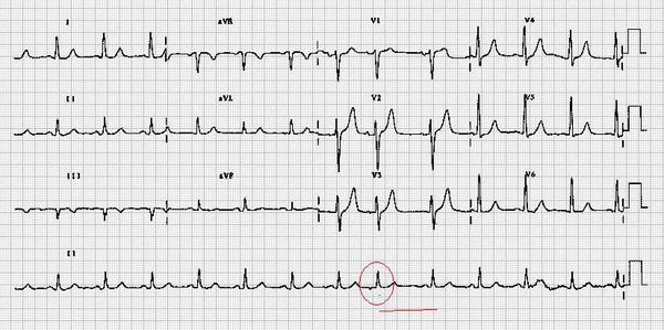 图三,早搏(注意红圈是提前出现的,破坏了原有的节律,而其后的间隔是延长的)